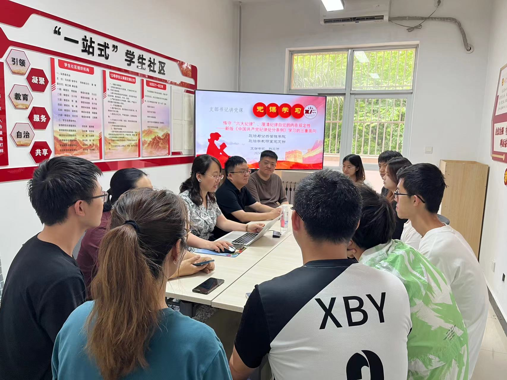 刘文沛同志围绕新版《中国共产党纪律处分条例》学习的三重面向,从党员、党组织与党中央的关系等三个层面,讲解了《中国共产党纪律处分条例》新修订的基本内容,结合警示教育事例,学习传达重要讲话精神,帮助支部成员坚定思想信仰,增强党性修养,提高政治素质,恪守“六项纪律”,筑牢思想根基,努力做到以高质量党建引领推动各项教学研究事业高质量发展。