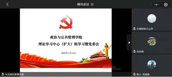 会上,集体观看了习近平总书记在省部级主要领导干部学习贯彻党的十九届六中全会精神专题研讨班开班式上的重要讲话精神。马光明传达了校党委会(扩大)会议精神,潘键、杨立峰通报了近期学生工作和教学情况,研究了2022年度国家社科基金项目申报组织工作,对落实学校关于加强学生教育引导、关心关爱学生、强化一线防控力量等工作进行再动员、再细化。
