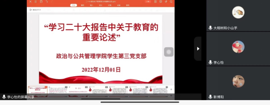12月1日,BB贝博艾弗森官方网站学生第三党支部组织集体学习会,会议采取线上线下相结合的方式,支部书记王小玲主持会议,学生党员李心怡领学。