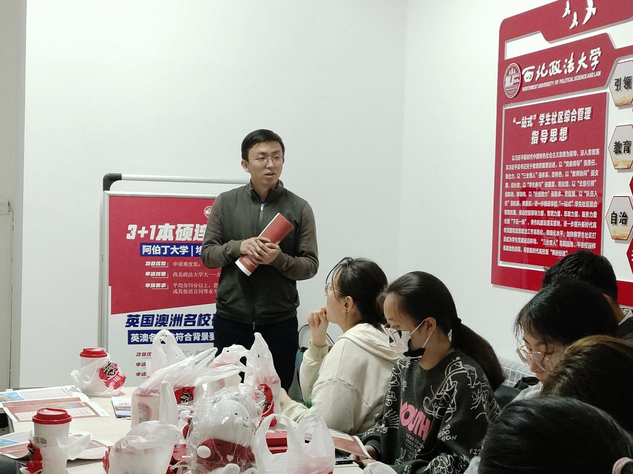 为引导学生了解当前升学就业形势,明确个人职业生涯规划,拓宽升学就业途径,4月21日BB贝博艾弗森官方网站与国际法留学项目办公室在13号公寓一站式社区建设办公室共同举办了2023年春季留学咨询进社区活动。本次活动由BB贝博艾弗森官方网站2021级辅导员梁传龙主持,国际法留学项目办公室朱玉莹和王乐两位老师主讲,来自民商法学院、刑事法学院、BB贝博艾弗森官方网站、新闻传播学院的20余名学生代表参加活动。