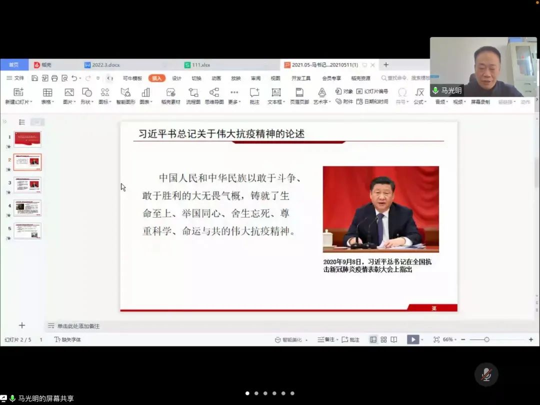 课堂伊始,马光明书记讲述了本次西安疫情期间我校党员先锋队为封控区考研学子提供送考服务的故事。习近平总书记曾在2020年的抗击新冠肺炎疫情表彰大会中提到,“中国人民和中华民族以敢于胜利的大无畏气概,铸就了生命至上、举国同心、舍生忘死、尊重科学、命运与共的伟大抗疫精神”,而我校在西安疫情期间开展的师生合作抗疫工作展示了生命至上的原则,集中体现了党全心全意为人民服务的宗旨。马书记通过联系中国传统士大夫的形象教育在场同学,要从伟大抗疫精神、现实抗疫工作中汲取智慧和力量,树立正确的价值观,通过自己的努力为人民群众服务。对于马上就要升入毕业班的2019级的同学,马书记希望同学们能够处理好“梦”与“马”的关系,以梦为马,不负韶华。