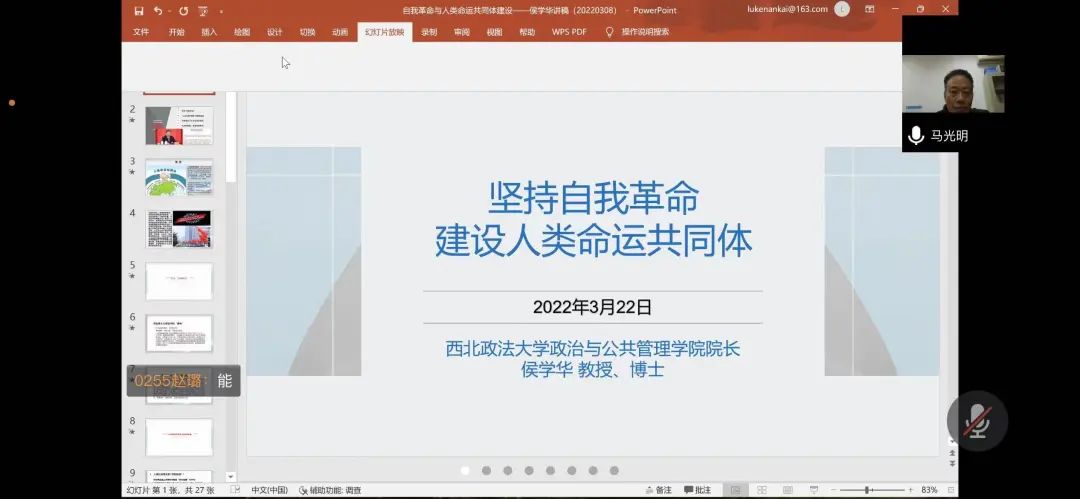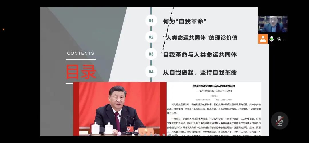 为深入贯彻党的十九届六中全会精神,加深同学们对自我革命和人类命运共同体的认识,号召同学们将自我革命意识融入思政教育中,2022年3月22日星期二,贝博召开了“坚持自我革命,建设人类命运共同体”的线上思政课,本次活动由马光明书记主持,侯学华院长主讲。侯学华从何为自我革命、人类命运共同体的理论价值、自我革命与人类命运共同体以及坚持自我革命四个方面为我们讲述了深刻而生动的一课。