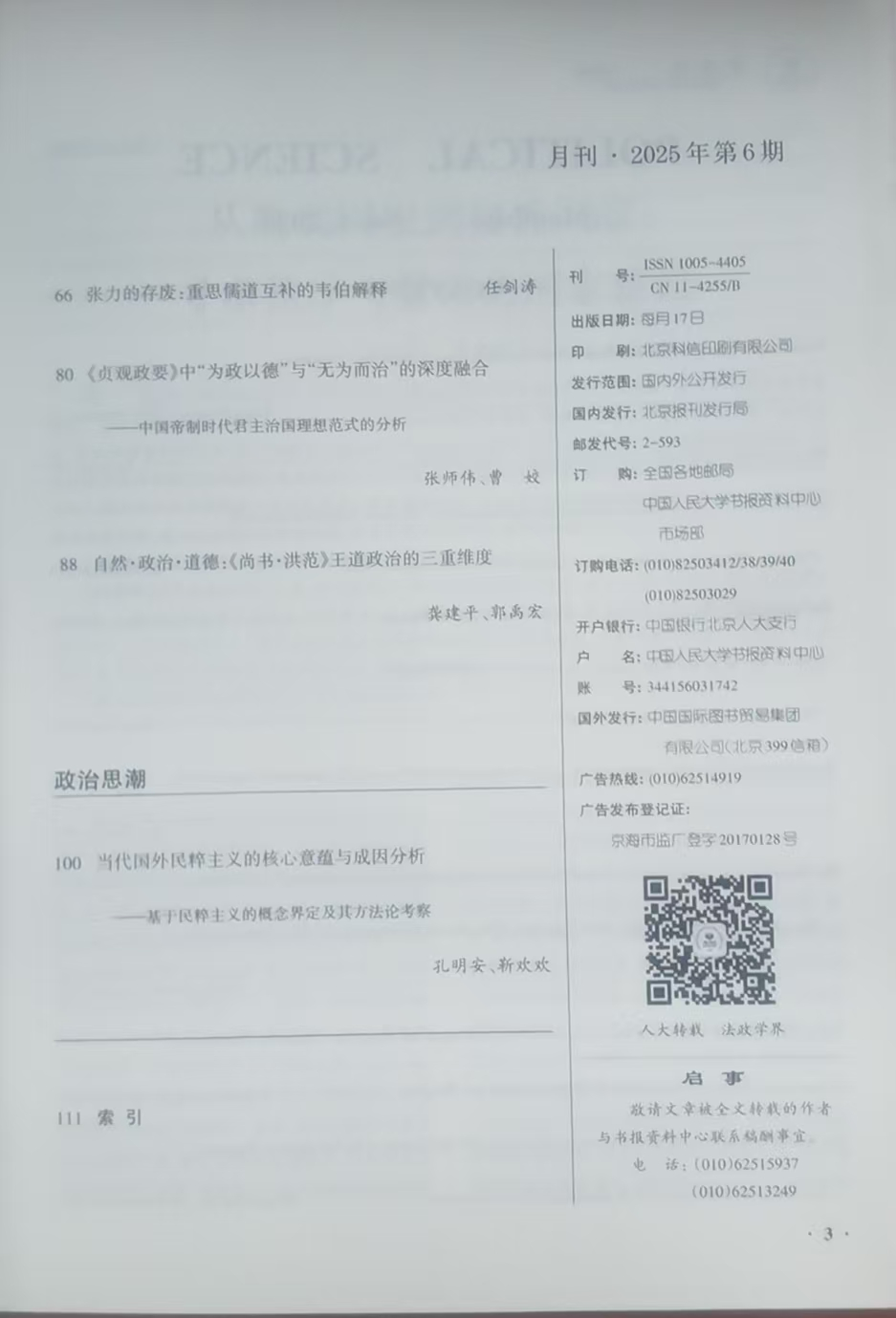 近日,我院张师伟教授与曹姣博士合作撰写的文章《<贞观政要>中“为政以德”与“无为而治”的深度融合——中国帝制时代君主治国理想范式的分析》被人大复印报刊资料《政治学》(2025年第6期)全文转载,该文章原载于《政治思想史》(2025年1期)。此次转载是张师伟第20篇被中国人民大学复印报刊资料全文转载的学术成果,彰显了张师伟在政治学理论、中国政治思想史及中共党史等研究领域的深厚造诣与持续探索。