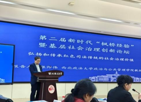 院长侯学华表示举办此次论坛有助于推动“枫桥经验”的学术资源与基层社会治理创新实践相结合,推动学院人才培养、教学科研模式改革,更好地实现大学服务社会的根本使命,并以《陕西坚持和发展新时代枫桥经验的实践探索》为题作主旨发言。张师伟教授以《弘扬和传承红色司法传统的社会治理价值》为题作主旨发言,李蔚博士以《农政变迁视角下农村集体经济促进共同富裕的逻辑理路》进行交流发言。
