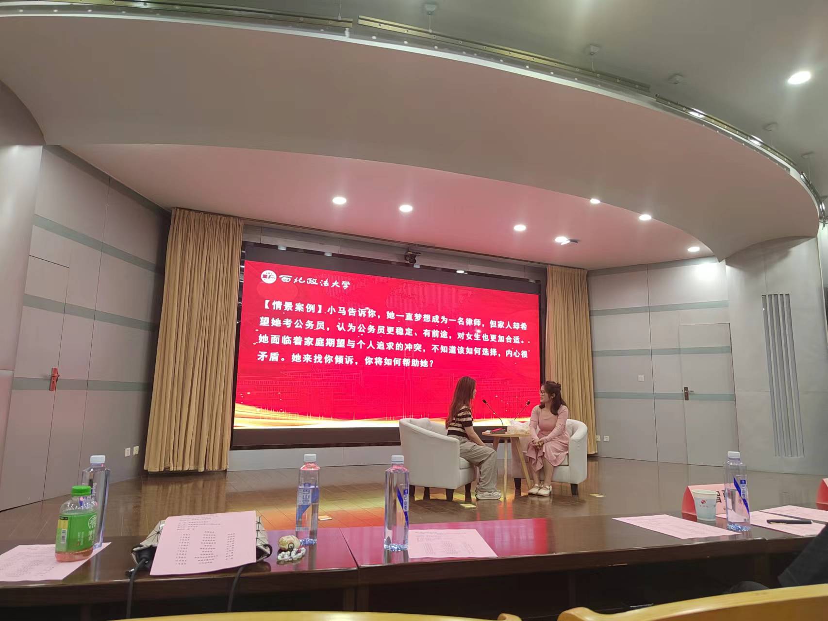在决赛现场,刘敏同学通过个人风采展示介绍了自己日常心理委员工作当中的点点滴滴和心得感悟,充分展示了过硬的素质和热忱的投入。在谈心谈话环节中,随机抽取情景案例,进行一对一的心理辅导谈话,刘敏以心理知识为支撑耐心细致为同学开展心理辅导,充分展现出心理委员的语言技巧和沟通能力。